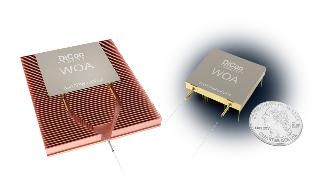 DiCon’s Waveguide Optical Amplifier (WOA) is an innovative alternative to traditional Erbium-Doped Fiber Amplifiers (EDFAs), the existing standard in fiber optic communication networks. This uniquely designed and meticulously fabricated waveguide device efficiently couples and transfers pump laser energy to live traffic signals. It delivers more than 25 dB of gain while producing much less Amplified Spontaneous Emission (ASE) noise, compared to typical EDFAs. With a hermetically sealed package and a form factor smaller than any existing EDFAs in the market, the WOA offers exceptional reliability and can be easily designed into any high volume commercial or mission-critical specialty applications. DiCon’s WOA is controlled by a separate external circuit, allowing expedient implementation and qualification.